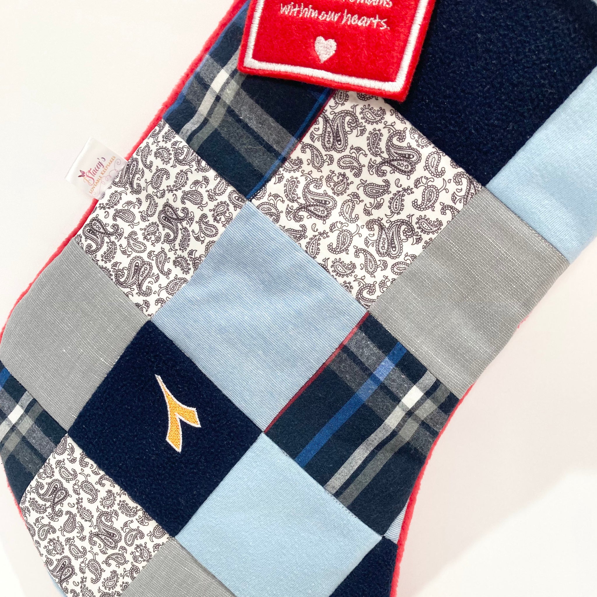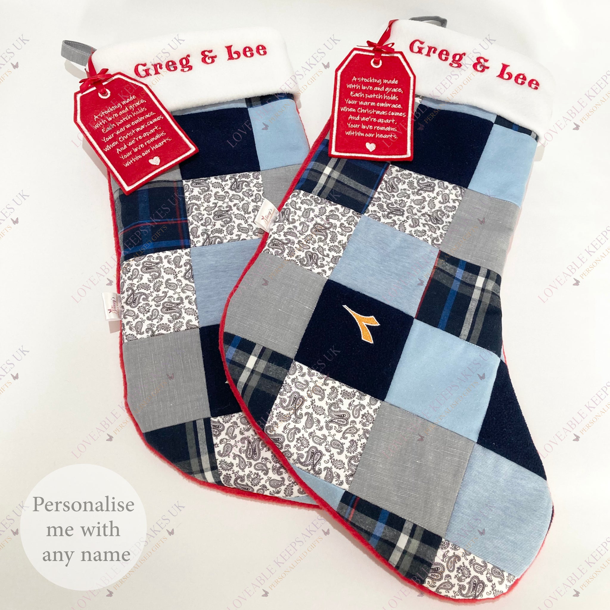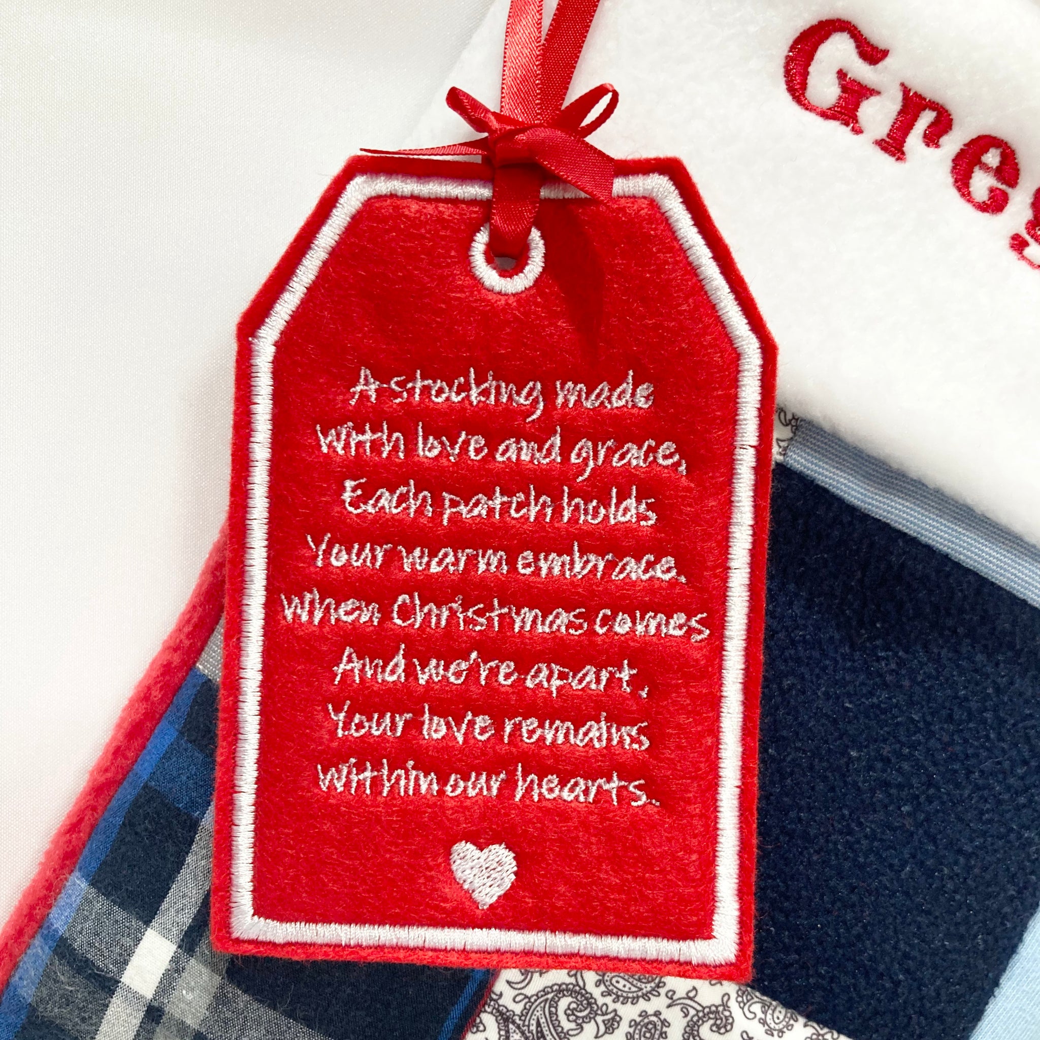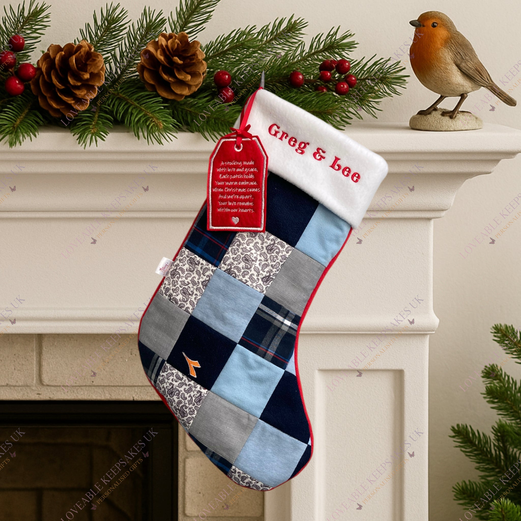 Memory Patchwork Christmas Stocking Made From Loved One’s Clothing – Personalised Name & Poem Tag