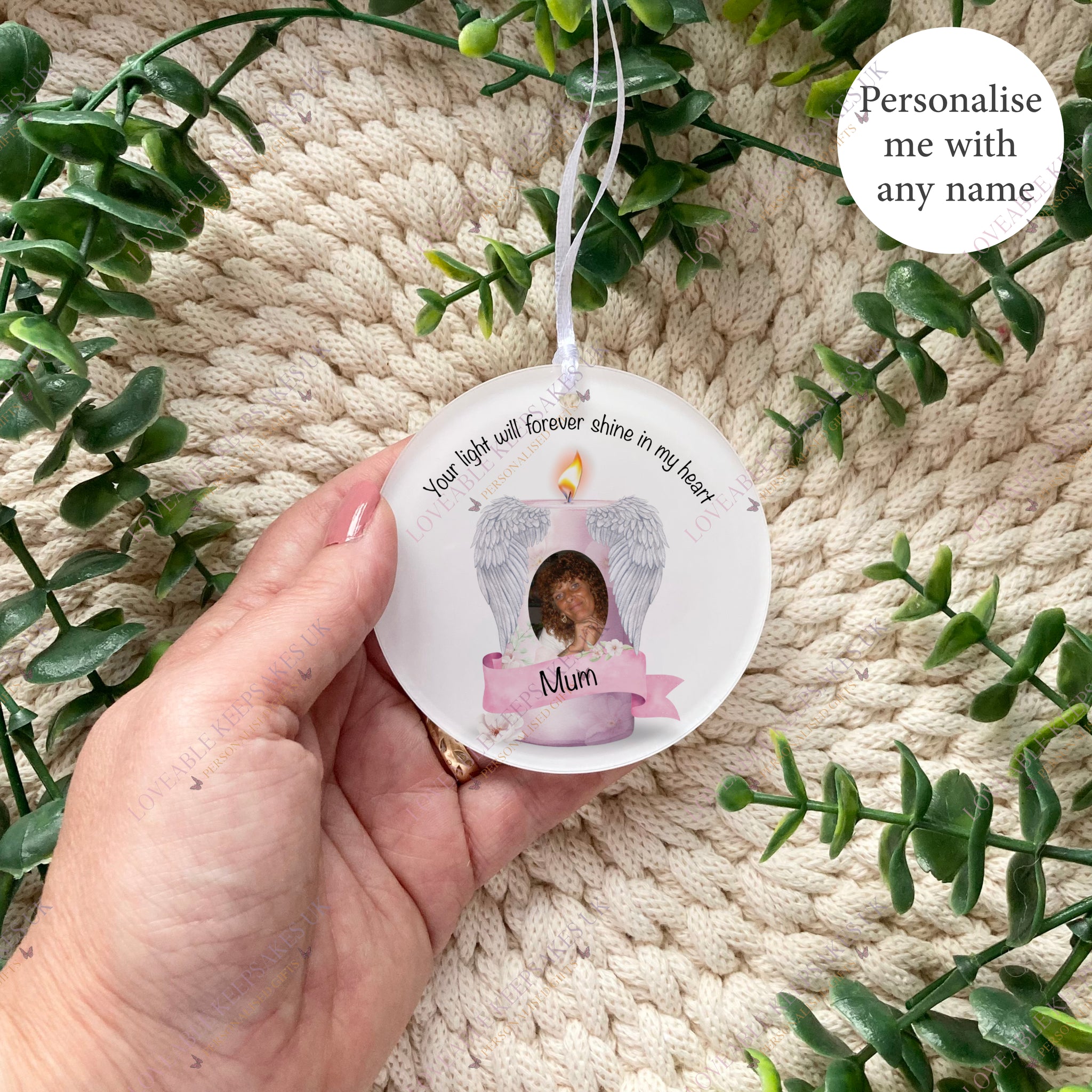 Whether hung on your Christmas tree or displayed year-round, this beautiful memorial ornament serves as a gentle reminder that your loved one’s light still shines brightly in your heart