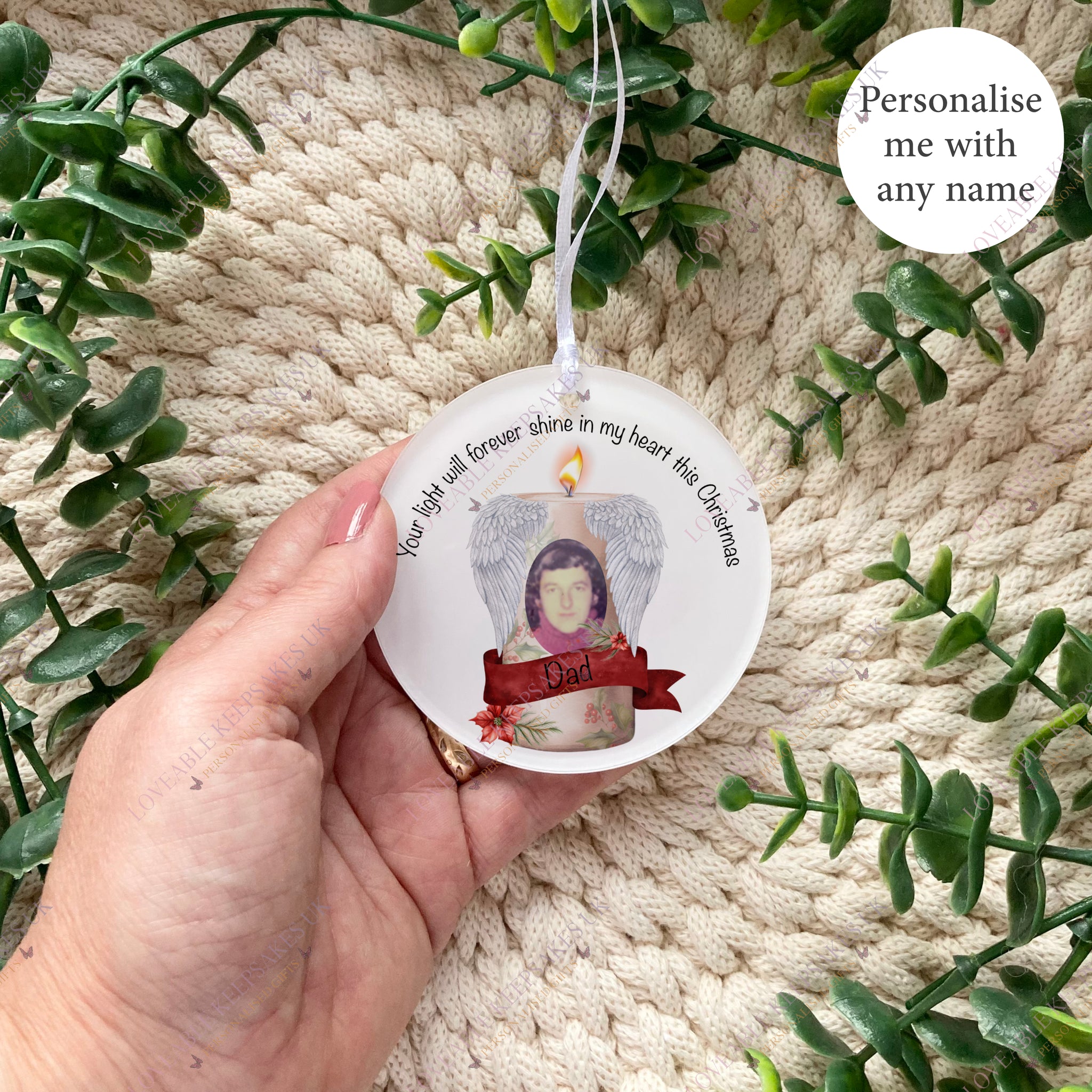 A truly special remembrance keepsake featuring your loved one’s photo — beautifully framed by delicate angel wings and a glowing candle design. Each bauble is handmade with love and care to honour the memory of someone special, bringing comfort at Christmas and beyond.