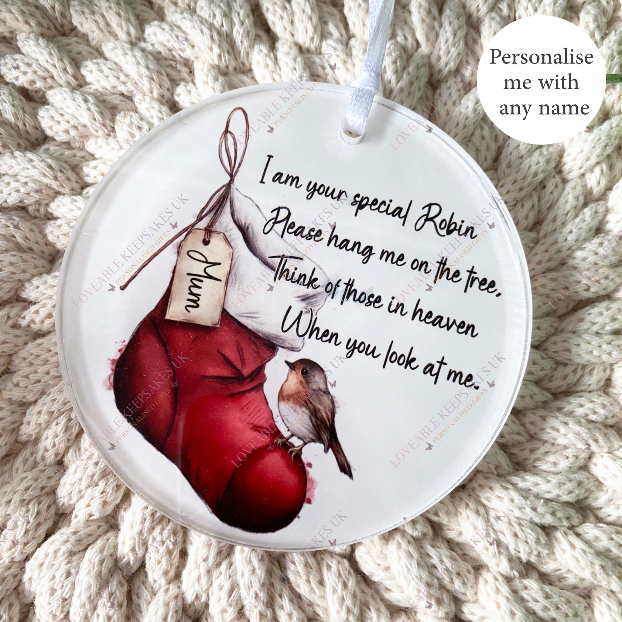 Personalised Robin Remembrance Bauble – Christmas Stocking Memorial Decoration – Acrylic Hanging Ornament Keepsake