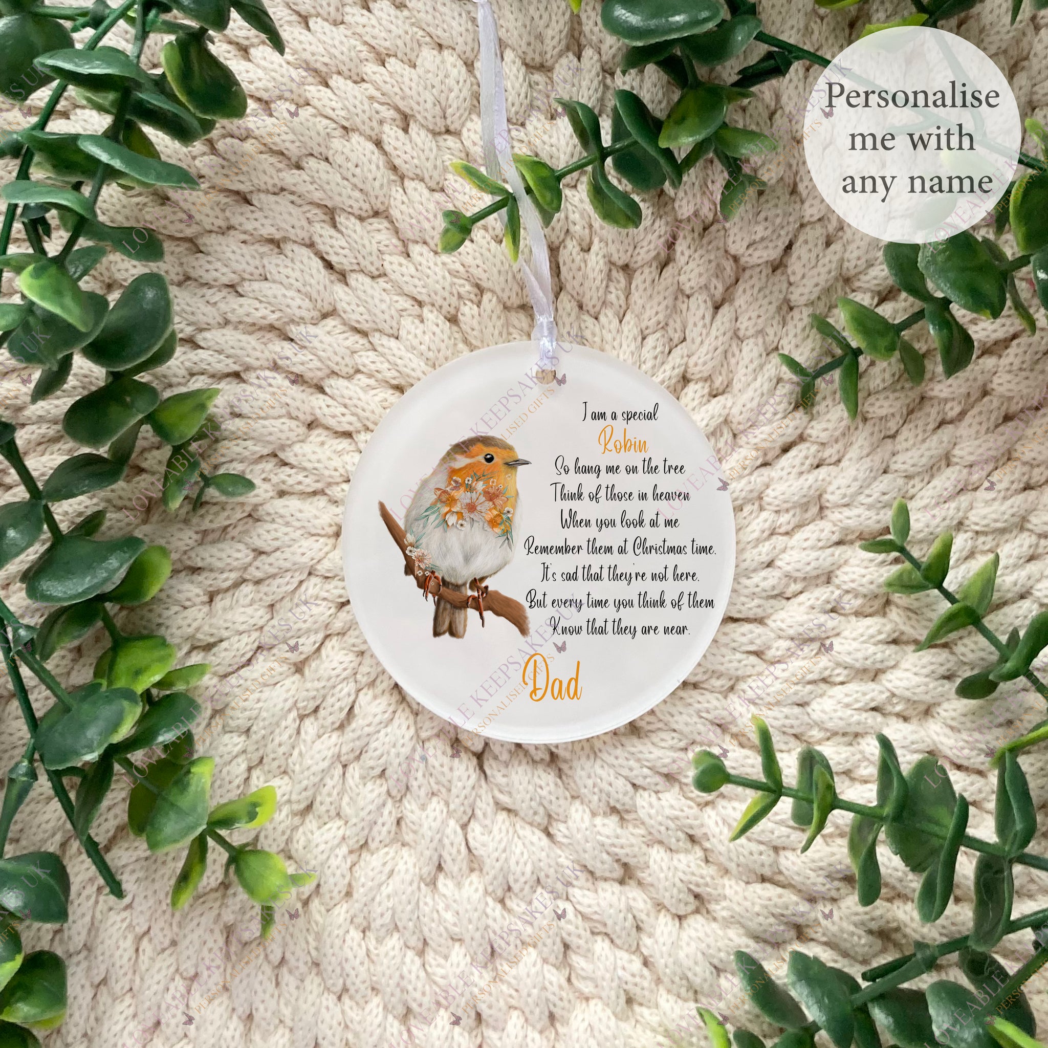 Personalised Robin Remembrance Bauble –Acrylic. Memorial Keepsake Decoration