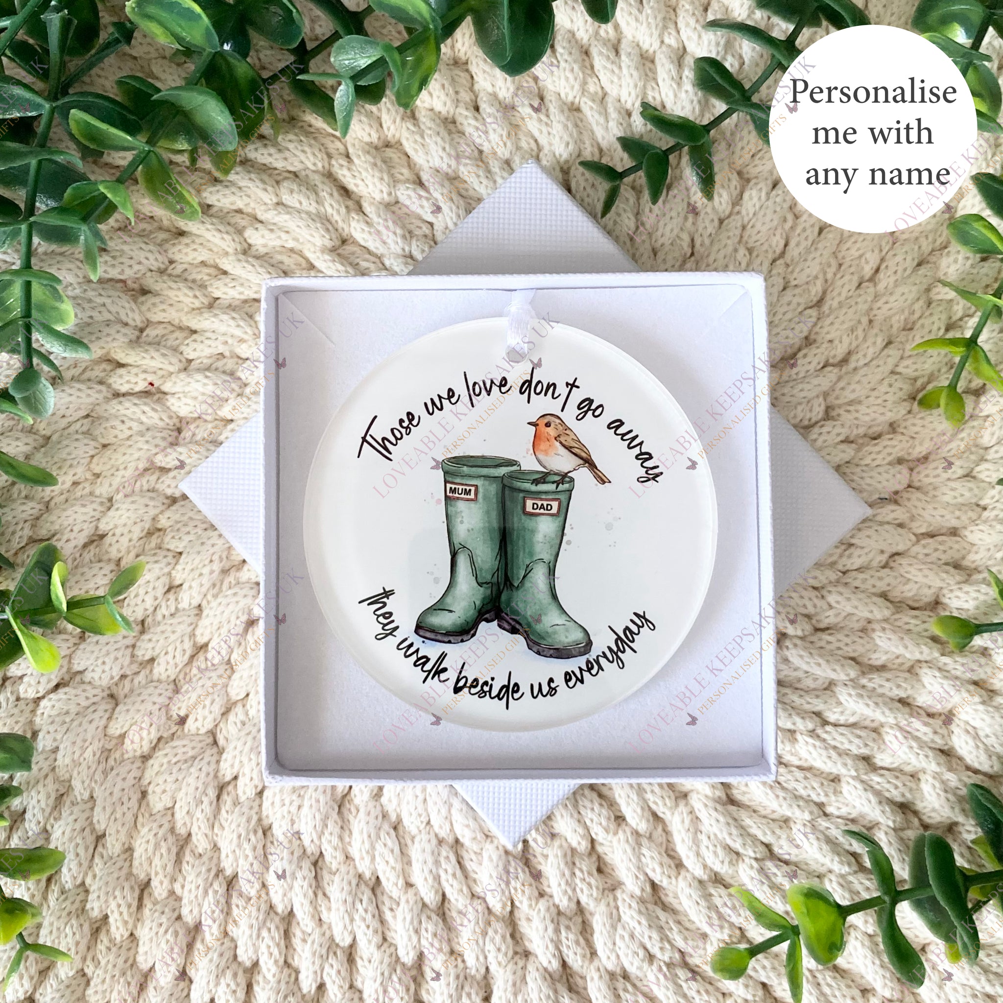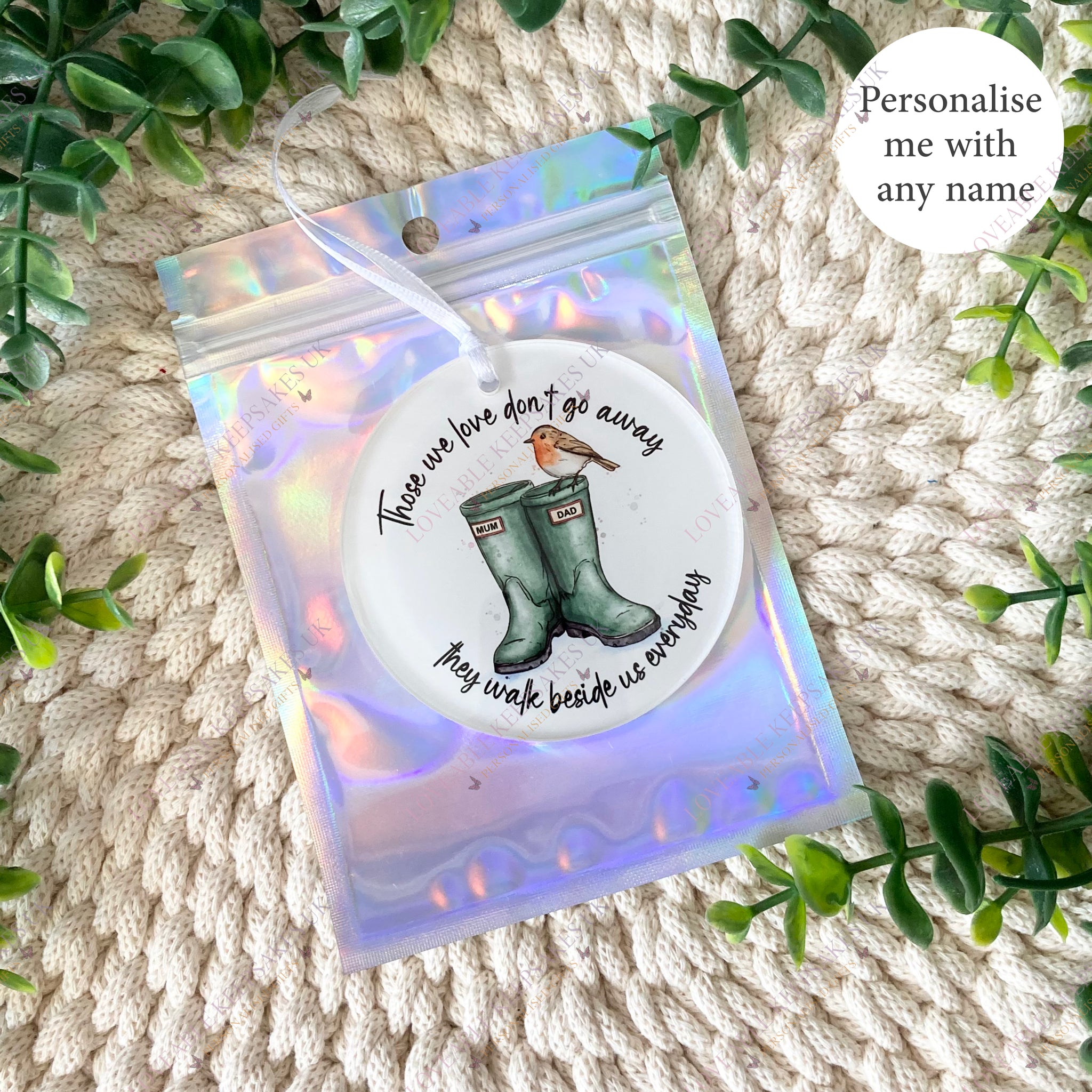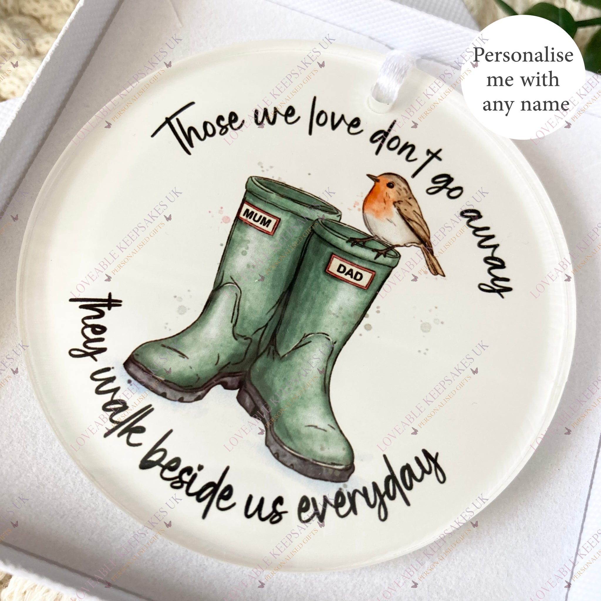 This personalised remembrance bauble features a hand-sketched robin perched on a pair of green boots. The name labels can be customised with your loved ones’ names. The design also includes the touching words: “Those we love don’t go away, they walk beside us every day.